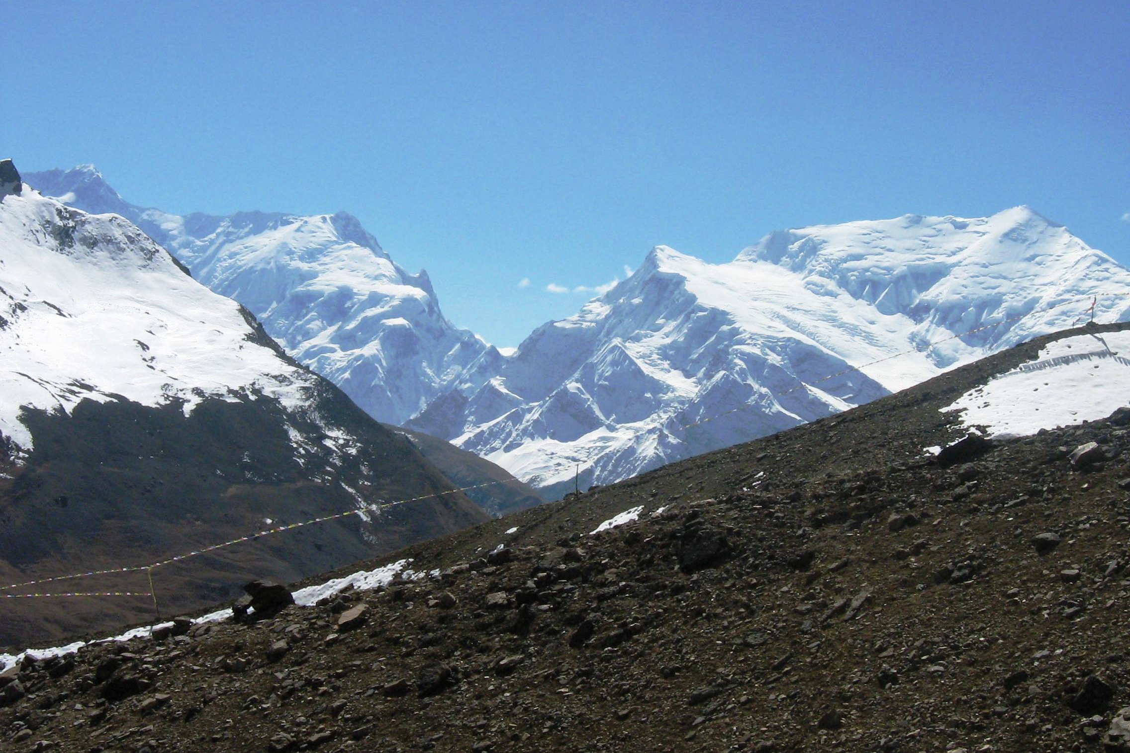 but it is steep and involves a glacier traverse on the eastern side. We cross it carefully as the trail is vertical and the rocks glazed by ice may cause the trail slippery. The trail from Phedi climbs through a ravine and a rocky trail with a frozen lake, at the top of the pass always decorated with prayer flags by locals while crossing in order to overcome with obstacles. The view of pyramidal Ama Dablam presides on the south, Cholatse soars to the west and Lobuche, Baruntse rises to our right. After crossing some crevasses, we reach at Dzongla with great views of Cholatse, Ama Dablam, Lobuche along with the Pheriche Village far below.