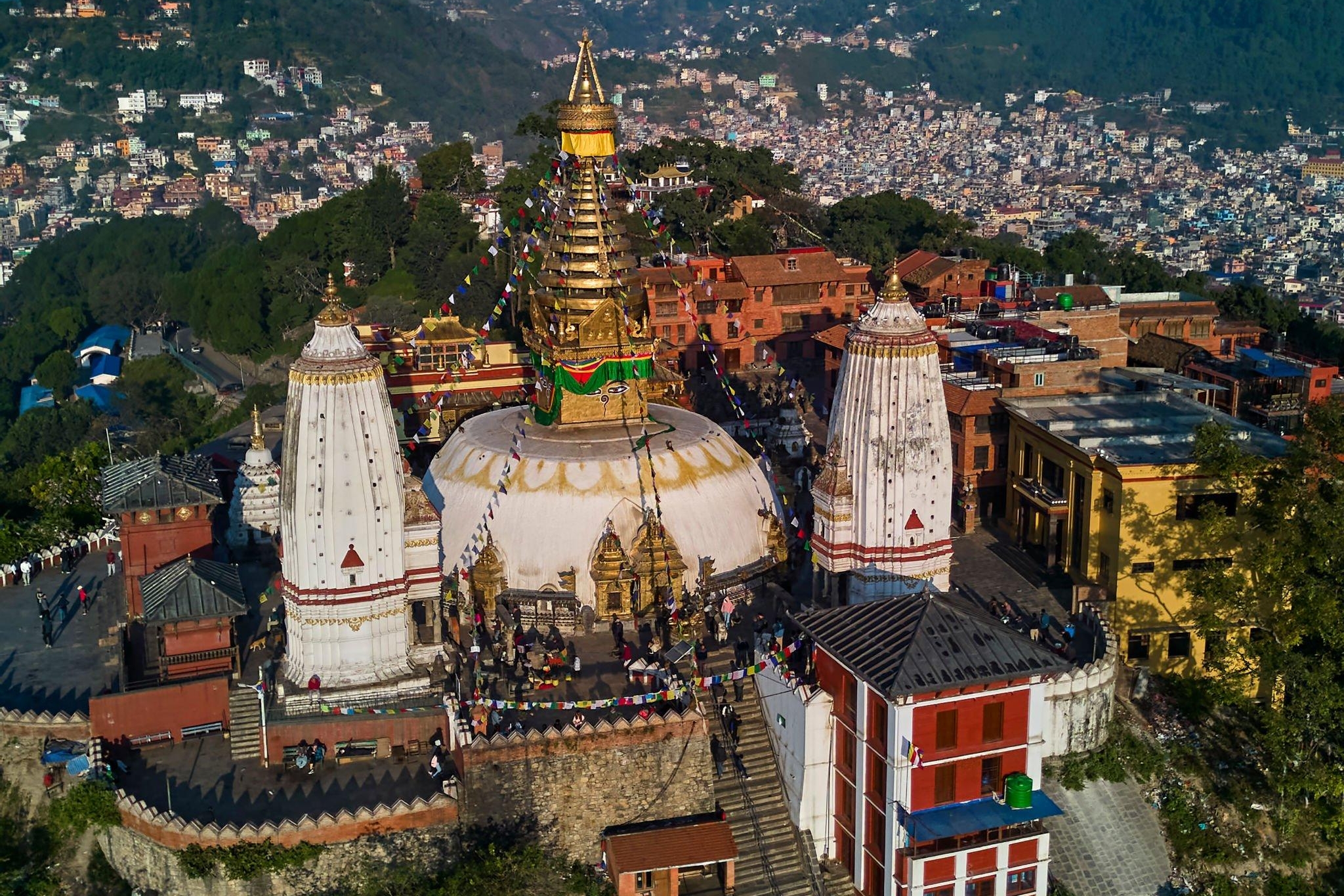 Visit Swoyambhunath Stupa with its 2,500-year history, UNESCO World Heritage Site, an ancient religious complex mobbed by monkeys and soaring above the city on a lofty hilltop, the fascinating, chaotic jumble of Buddhist and Hindu iconography. Even the 2015 earthquake failed to topple Kathmandu's best-loved temple, you could see ancient carvings everywhere and the smell of incense and butter lamps, the mystical atmosphere is heightened by devotees who make a ritual circumnavigation, spinning the prayer wheels set into its base of this famous stupa, and surrounded by beautiful typical houses of the priest, Chaityas and monastery.