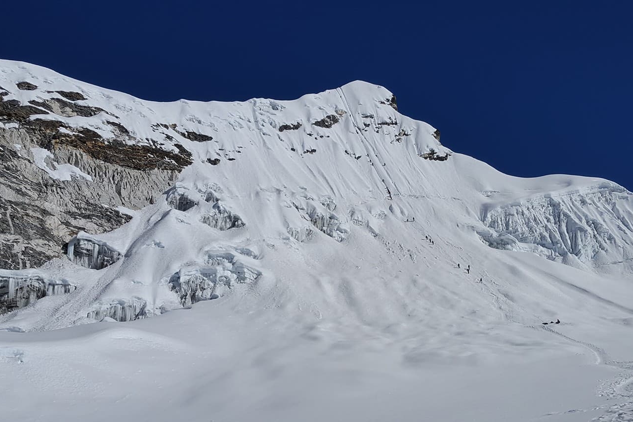 After walking for about 3 hours you reach the place where you have to put on your crampons. The glacier begins at about 5800 meters. Along the glacier there are several sections secured with fixed ropes and ladders. The most exciting part is yet to come. You have to be very careful and pay maximum attention.