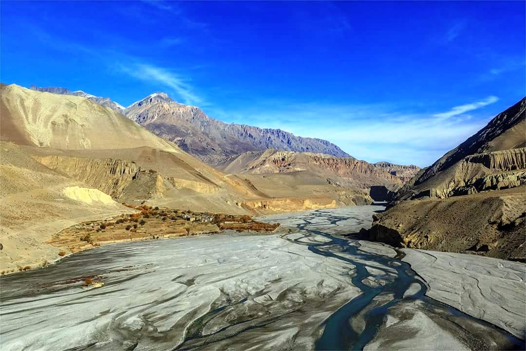 Today is our final day of hiking, and we kick it off early to appreciate the majesty of Dhaulagiri backlit by the warm rays of the rising sun. We'll treat ourselves to a side trip to the Bon Punt monastery in Lubra before walking back to Jomsom. After Lubra, the trail leads to the Kali Gandaki and the river Panga - we'll have to leap over it a couple of times before the day is through! Where the two rivers meet, we join the main trekking path back to Jomsom.